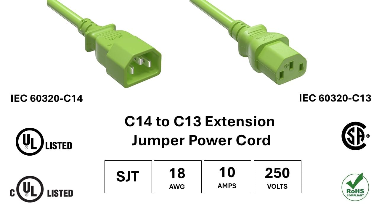 ompuCablePlusUSA.com C14 to C13 Extension Power Cord, 18AWG, Green, and product info, UL, cUL, CSA, and RoHS certified.