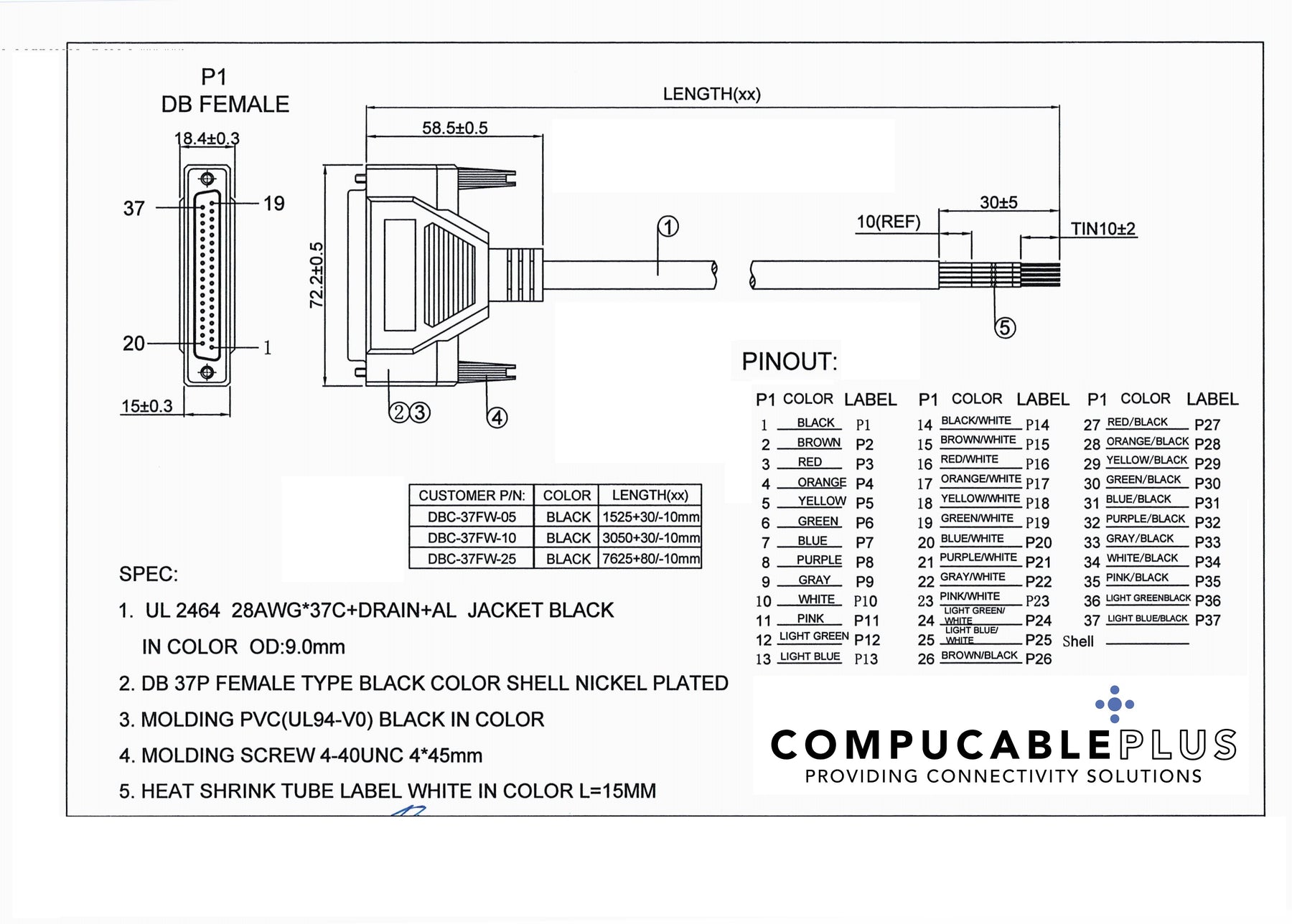 5 Feet Part Number DBC-37FW-05 & DBC-37FW-05-MF