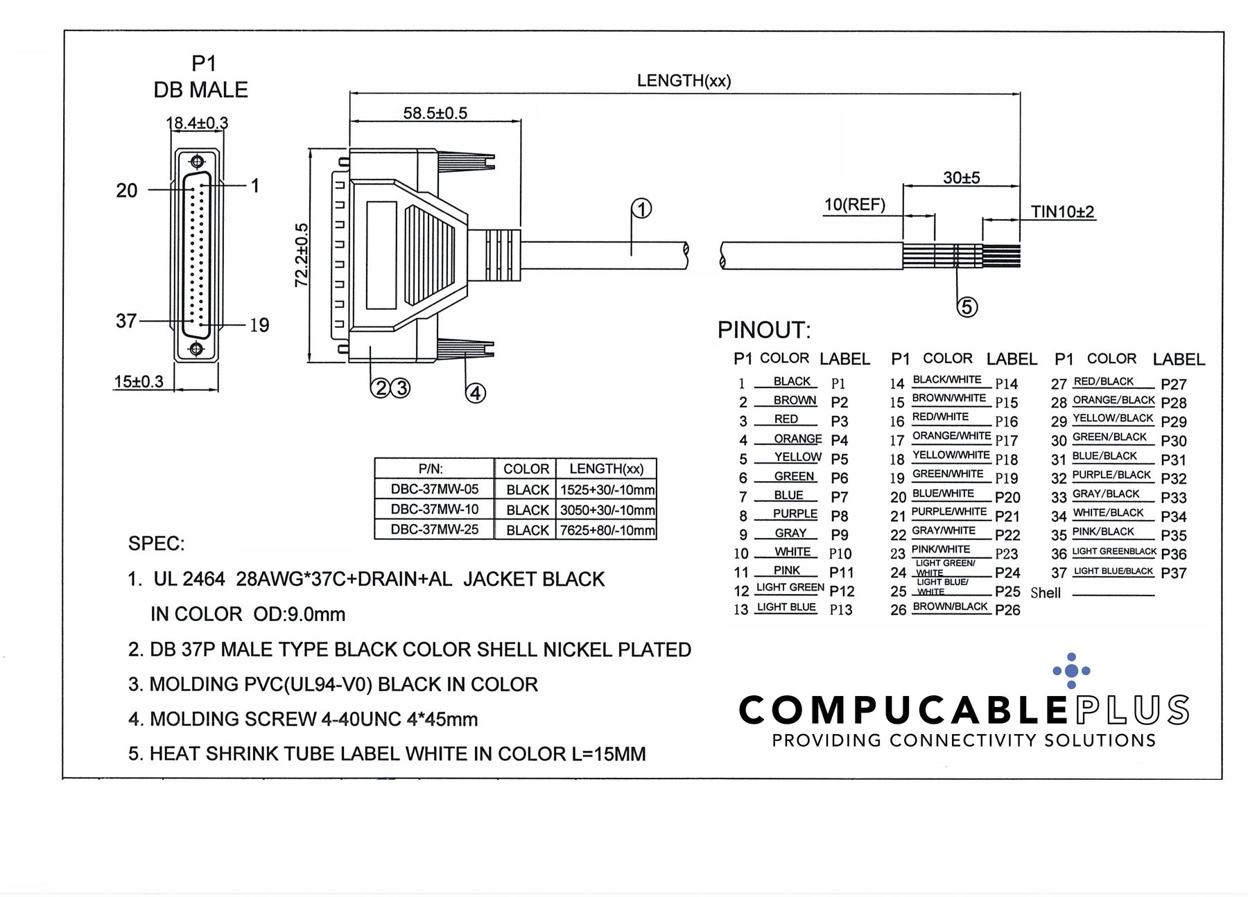 CompuCablePlusUSA.com Best RS232 Serial Adapter Cable to Bare Wire End, DB37, Shielded, Molded Plug (Male) with Bare Wire Leads, 5, 10, 25 Feet Length; Each Wire Lead is a Separate Color for Easy Identification and They are Labeled with the Pin that They are Connected to. Those with DB37 Connections are RS-232, so They Transmit Data between Computers and Equipment. The Thumb Screws on These Connectors Have Slots so They Can be Tightened with a Screwdriver in Tight Spaces.