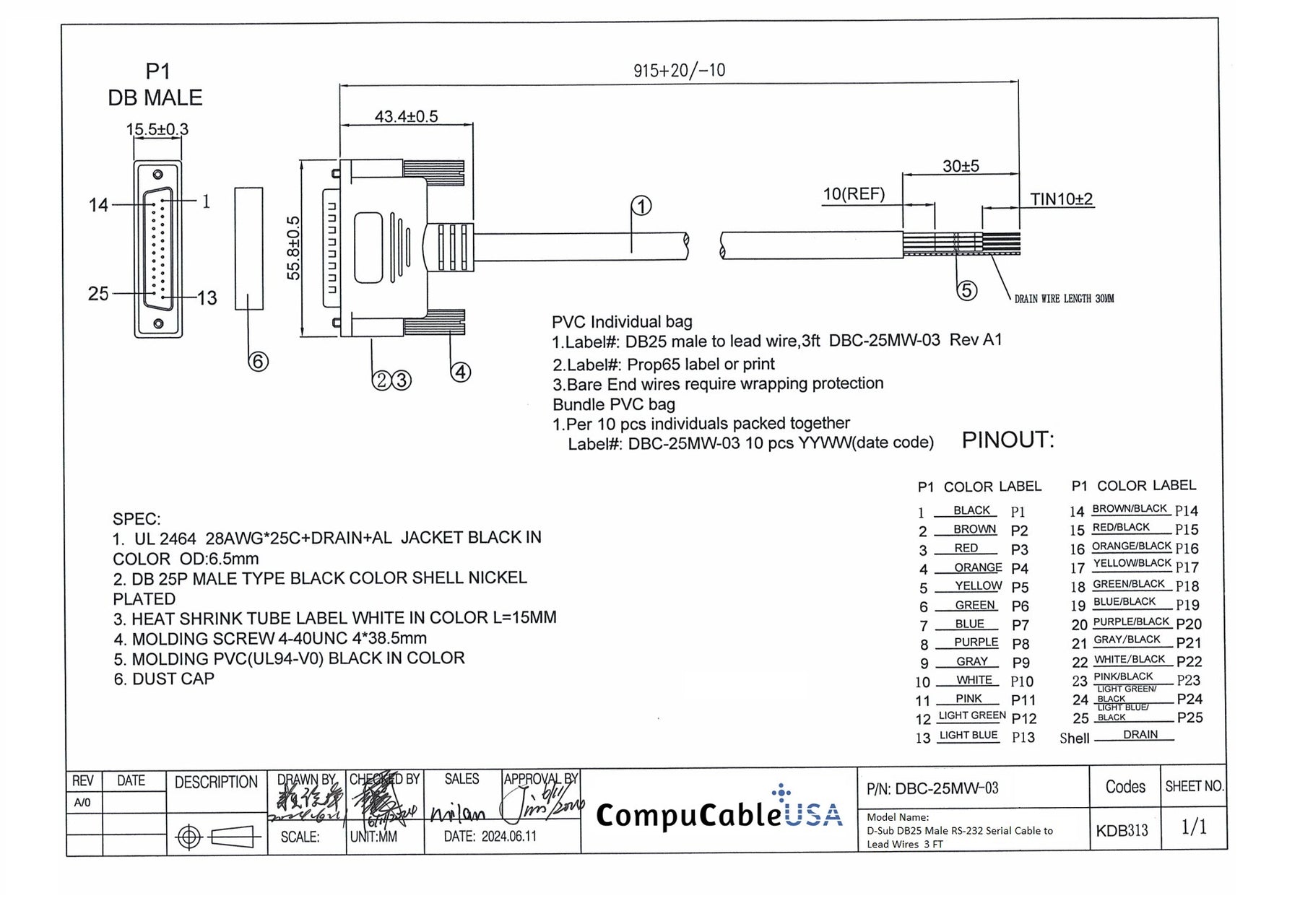 Product Title :?Compucableplususa.com Best Industrial Serial DB25 D-Sub 25 Pin RS232 Serial Cable with Bare Wire - 28 AWG with Black PVC Jacket (Male, 3/5/10/15/25/35 Feet)