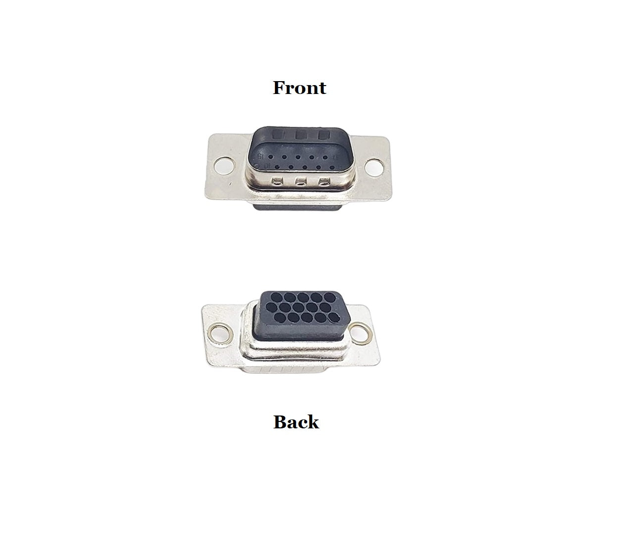 CompuCablePlusUSA.com D-Sub Crimp Type High Density DB15 3 Row Connector front view and back view images.